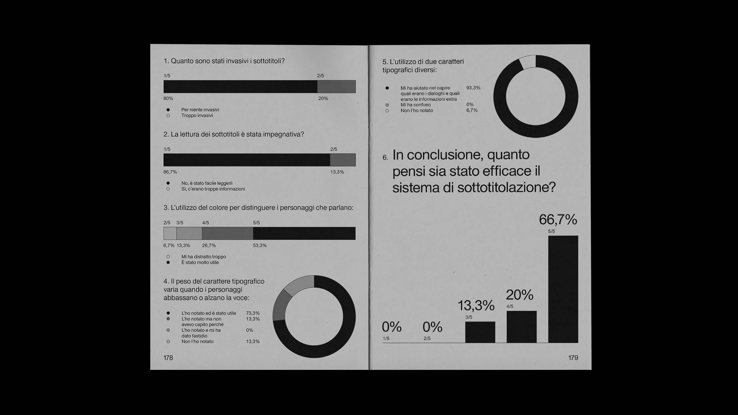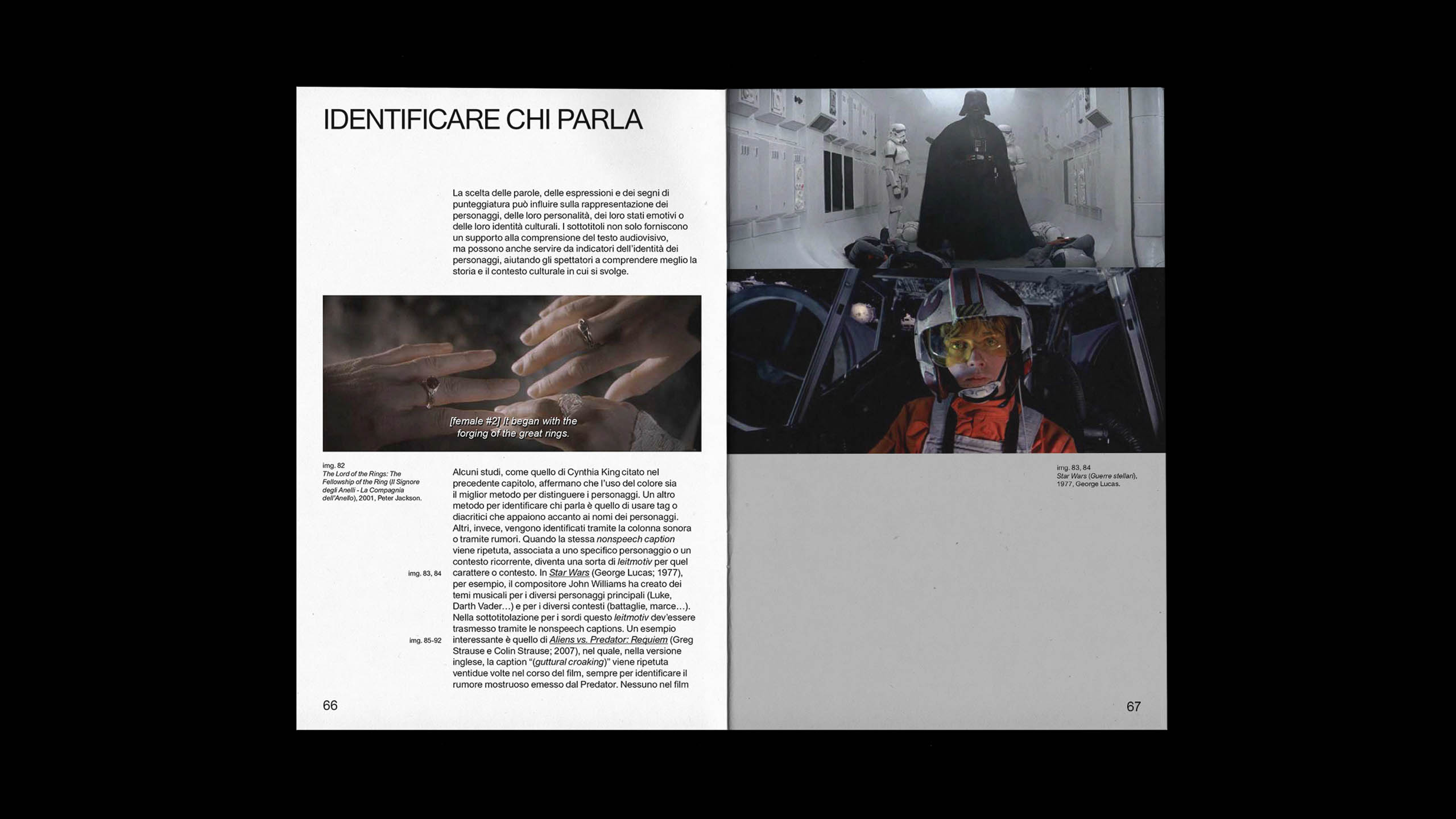 Through testing phases, people with hearing disabilities were involved to identify the most effective methodologies for visually representing characters’ speech manners, their tone of voice, noises, and music. The project ended with the organization of a film screening and the creation of an editorial project.